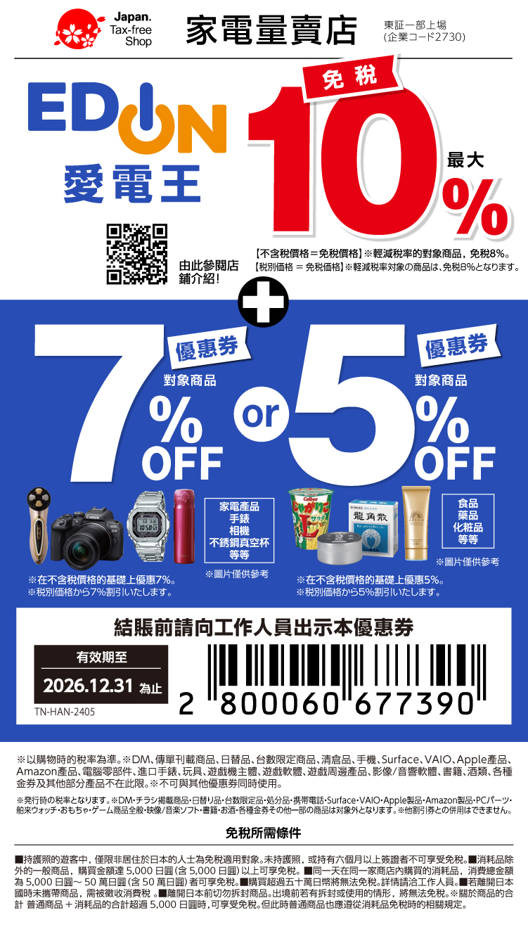 滿5,000日圓享免稅10%+優惠7%